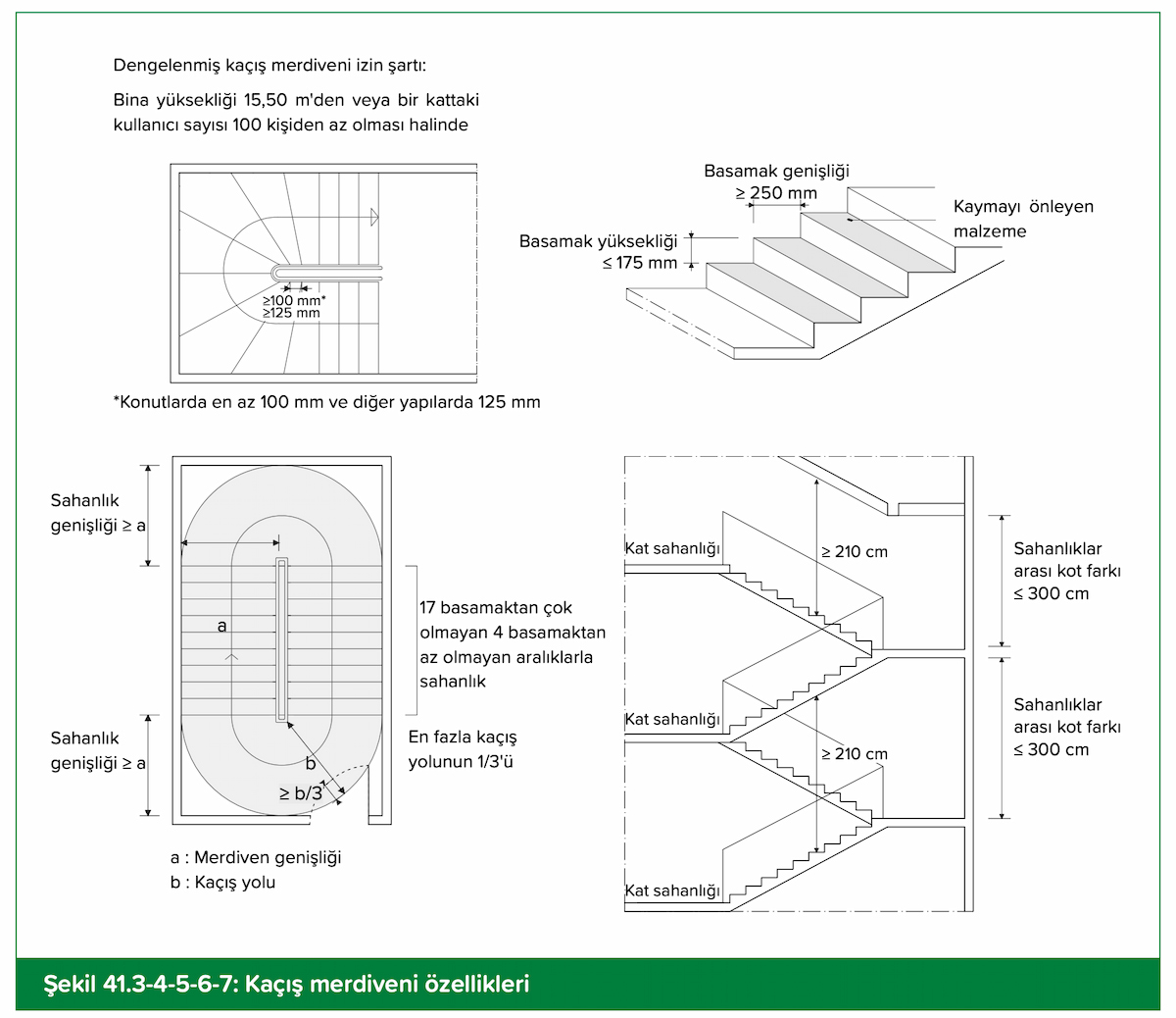 3. Kaçış merdivenlerinde her döşeme düzeyinde 17 basamaktan çok olmayan ve 4 basamaktan az olmayan aralıkla sahanlıklar düzenlenir. Bina yüksekliği 15,50 m’den veya bir kattaki kullanıcı sayısı 100 kişiden fazla olan binalarda dengelenmiş kaçış merdivenlerine izin verilmez.
