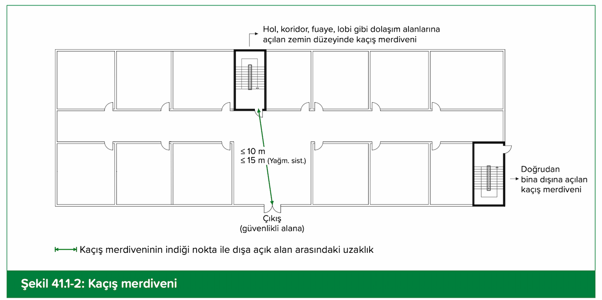 2. Kaçış merdiveninin, zemin düzeyindeki dışarı çıkışın görülebildiği ve engellenmediği hol, koridor, fuaye, lobi gibi bir dolaşım alanına inmesi hâlinde, kaçış merdiveninin indiği nokta ile dış açık alan arasındaki uzaklık, kaçış merdiveni bir kattan daha fazla kata hizmet veriyor ise 10 m’yi aşamaz. Yağmurlama sistemi olan yapılarda bu uzaklık en fazla 15 m olabilir. Dışa açık alanın, kaçış merdiveninin indiği noktadan açıkça görülmesi ve güvenlikli bir şekilde doğrudan erişilebilir olması gerekir. İç kaçış merdivenlerinden boşalan kullanıcı yükünü karşılayacak yeterli genişlikte dışa açık kapı bulunması şarttır.