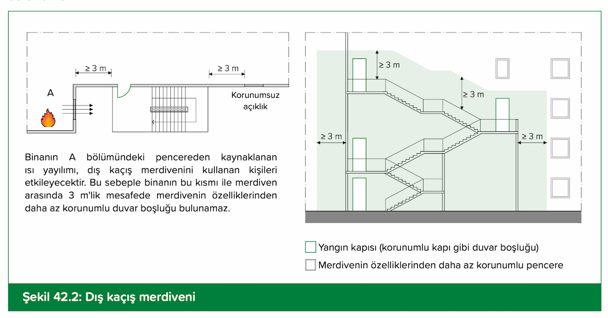 2. Açık dış kaçış merdiveninin herhangi bir bölümüne, yanlardan yatay ve alttan düşey uzaklık olarak 3 m içerisinde merdivenin özelliklerinden daha az korunumlu kapı ve pencere gibi duvar boşluğu bulunamaz.